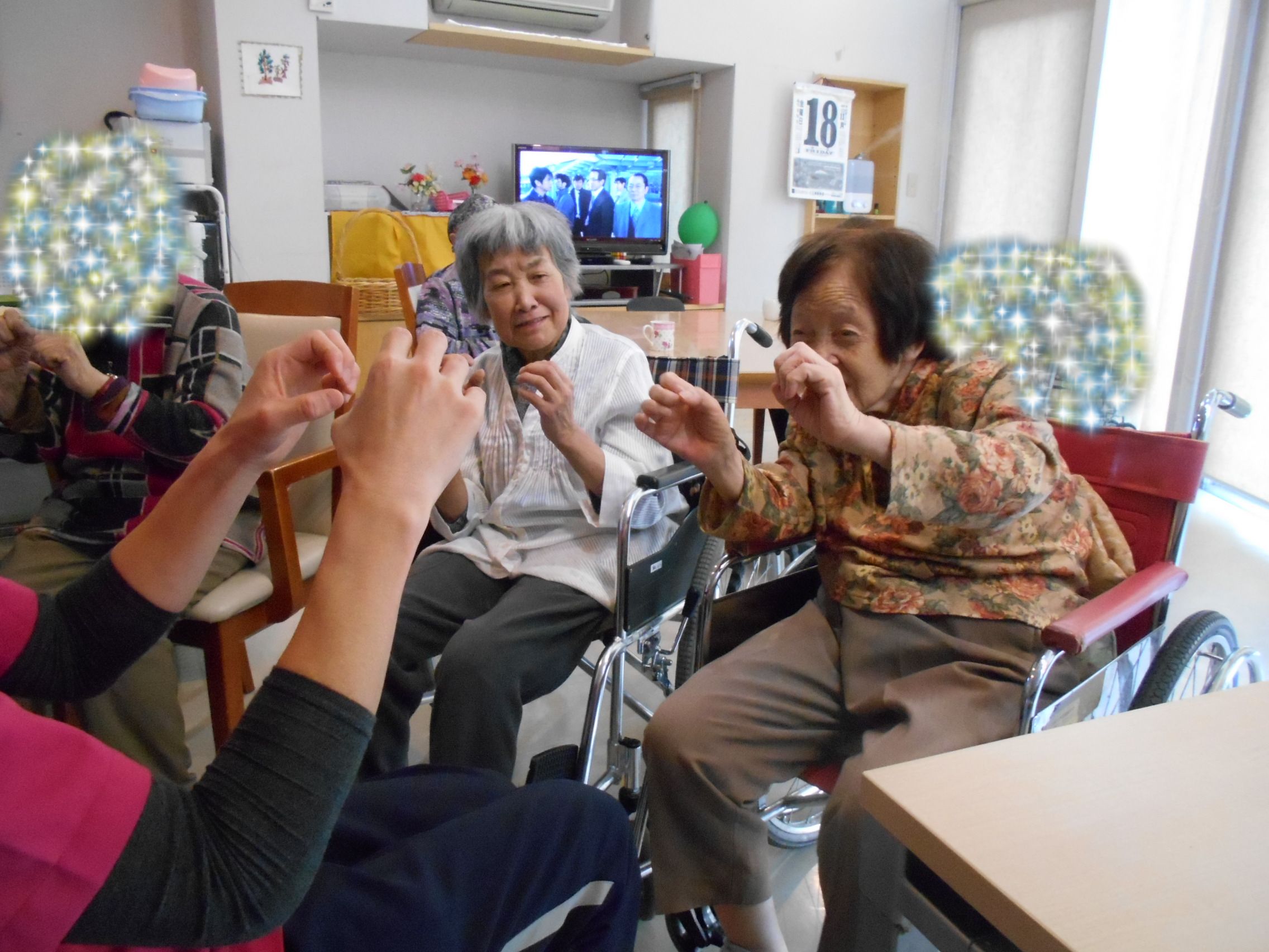 これはペン、これはお手玉、合体するとお手玉ペンになりました。と明るくお客様に伝えると面白いと笑顔がみられました。