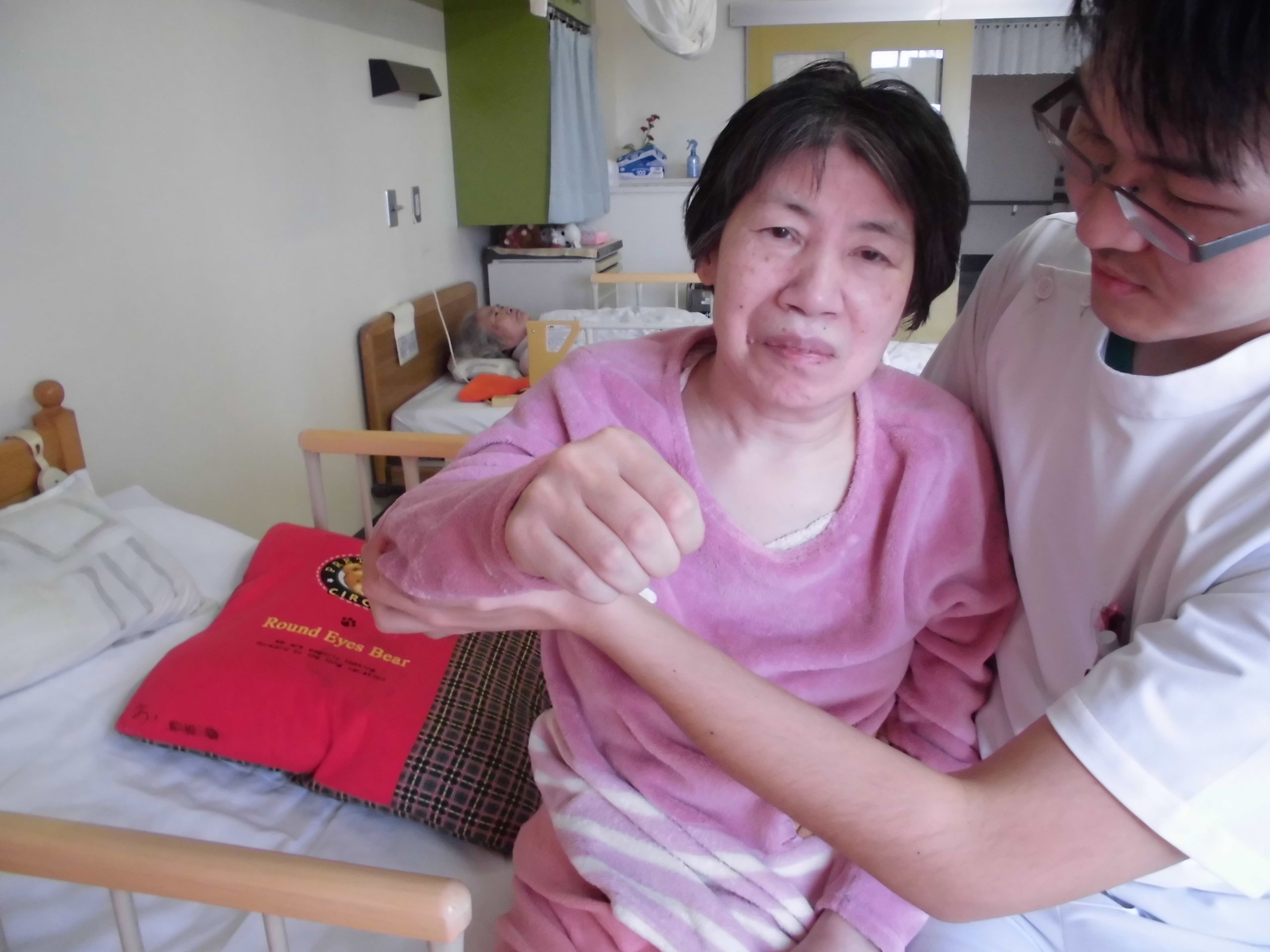 次は上肢の関節運動を行いました。左肩は右肩に比べて硬い印象でしたが本人も頑張って腕を上げてくれました。右肩も頑張って上げてくれました。
