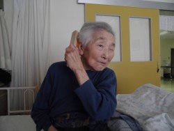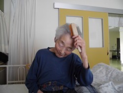 ベッド上座位にて櫛を使用したリハビリを行いました。