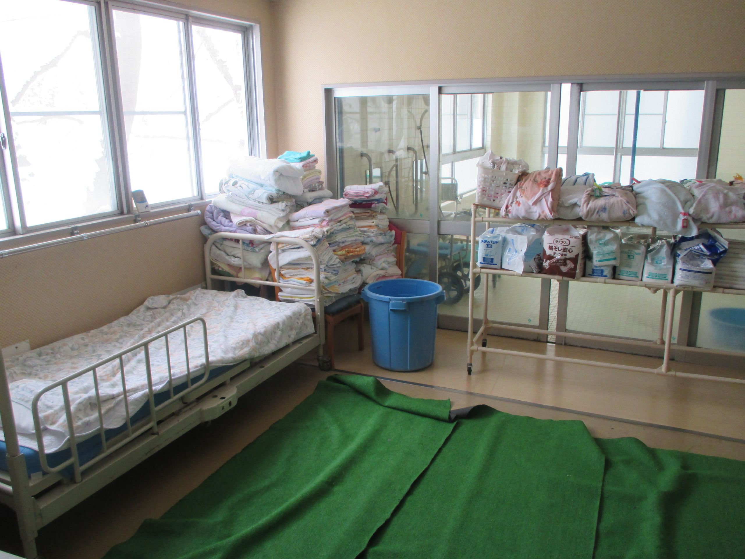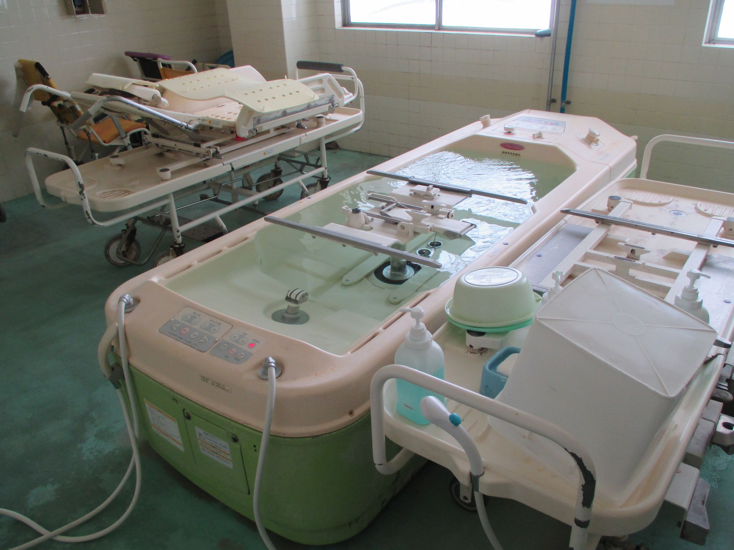 こちらは機械浴です。曜日やお客様によって機械浴、一般浴と違いがあります。本日は機械浴です。私達職員はここでお客様の身体や頭を綺麗に洗い流し、気持ち良く温まってもらうために日々頑張っております!