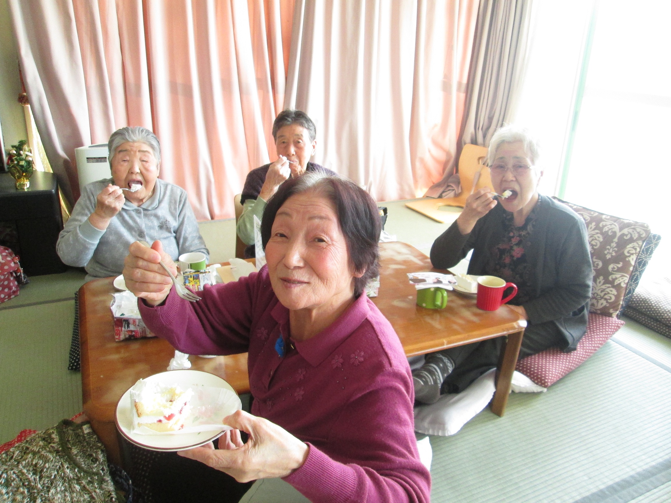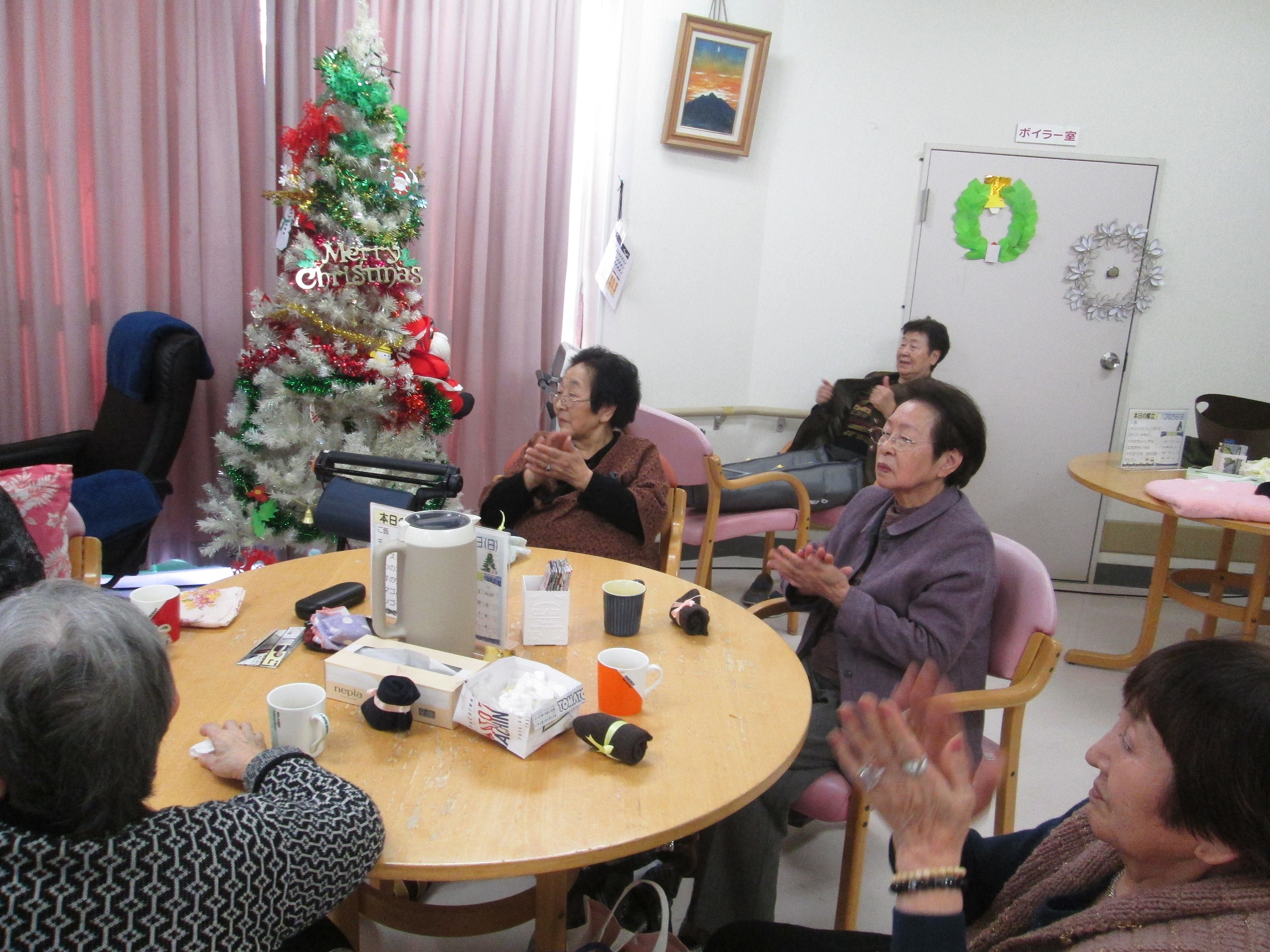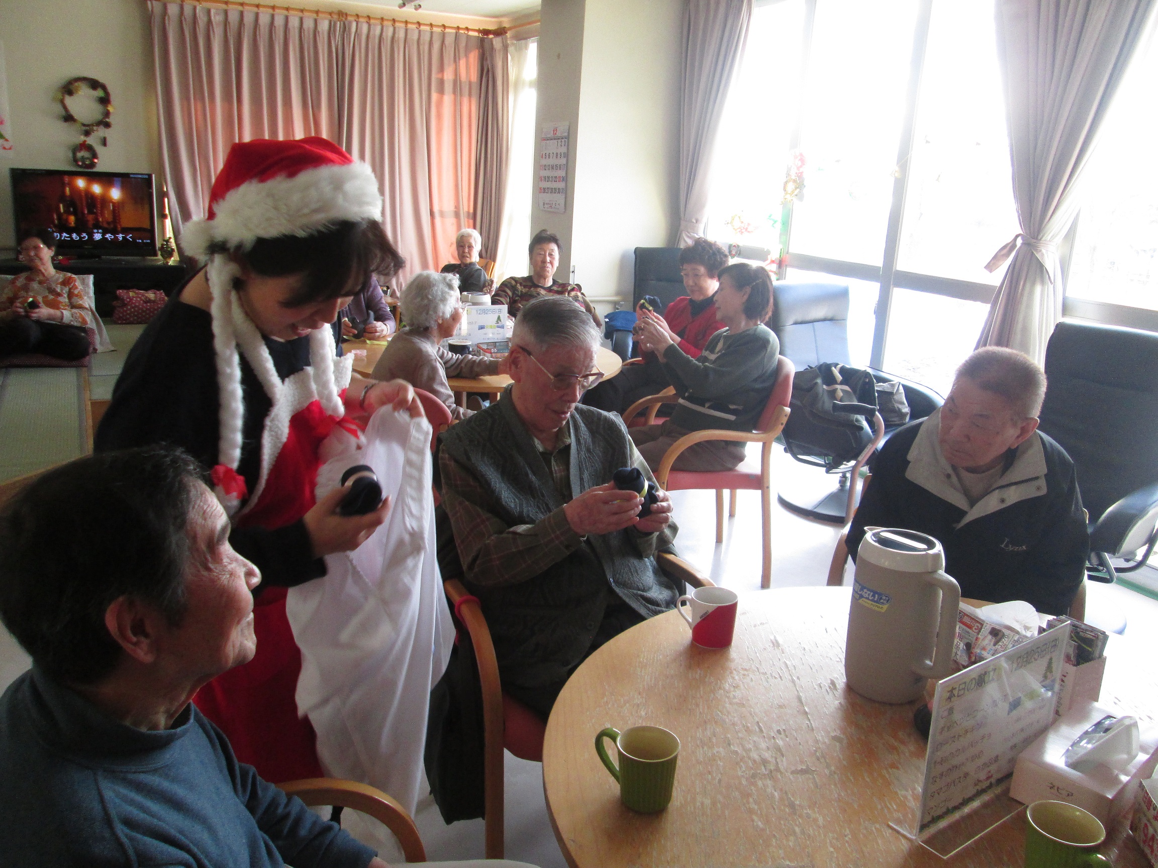 今日は楽しいクリスマス♪♪♪皆さんケーキを目当てにたくさん!参加され、とっても元気です。サンタさんがデイサービスにも、クリスマスプレゼント♪運んで下さり、皆さん大喜びです♪