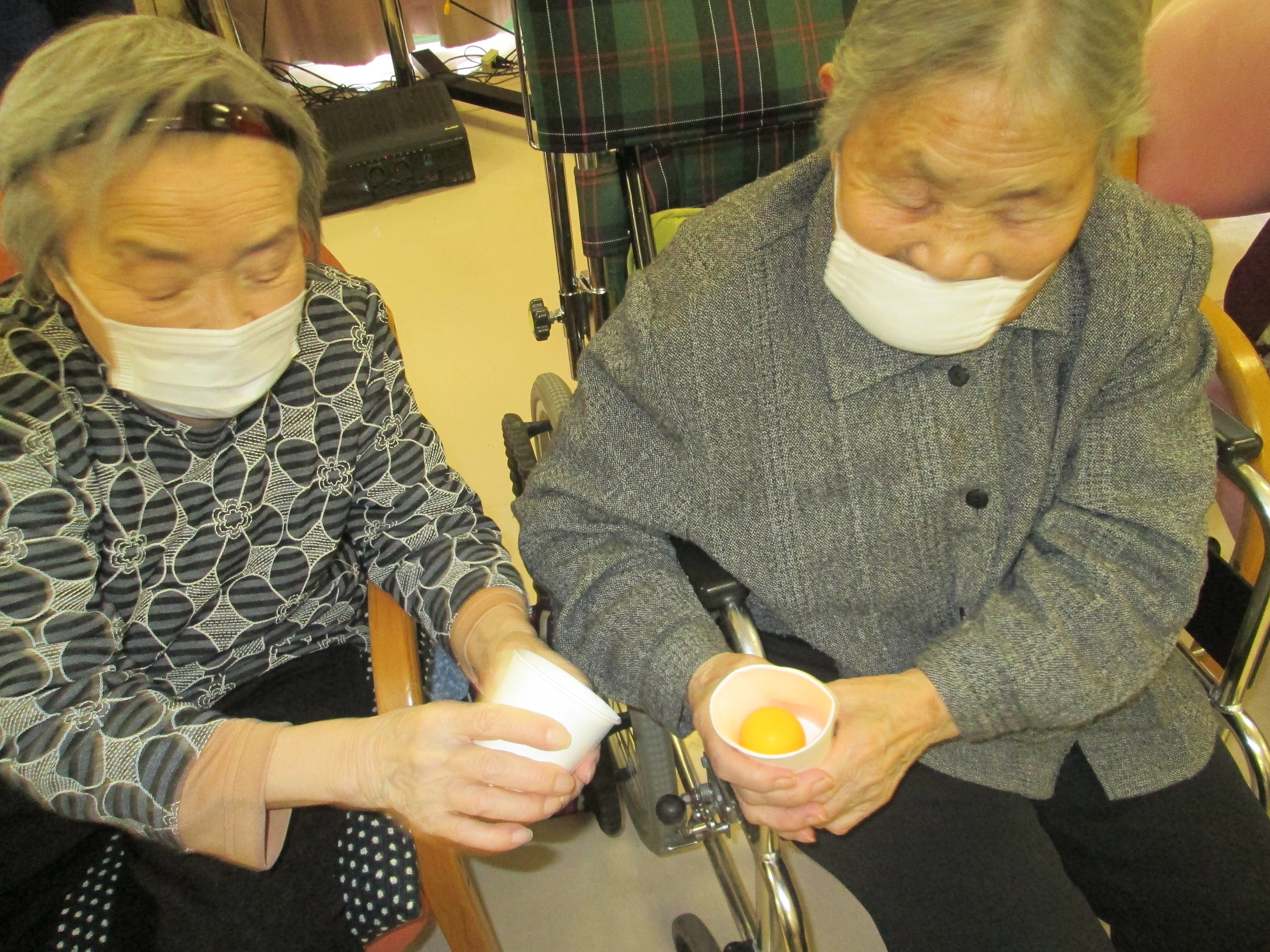 隣り同士ピンポン玉を送ってるよ!落とさないように頑張ってまーす。