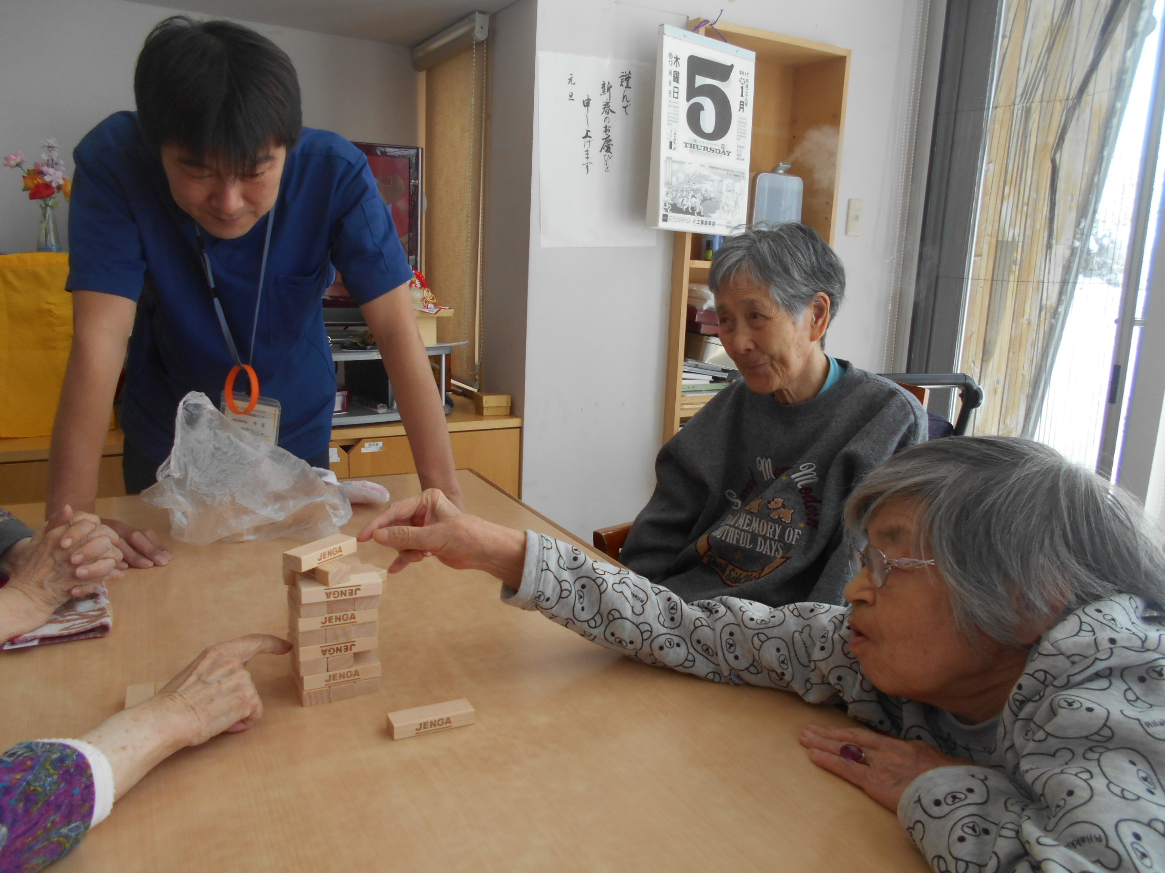 午前の余暇活動の時間に皆様で、ジェンガゲームを楽しみました。