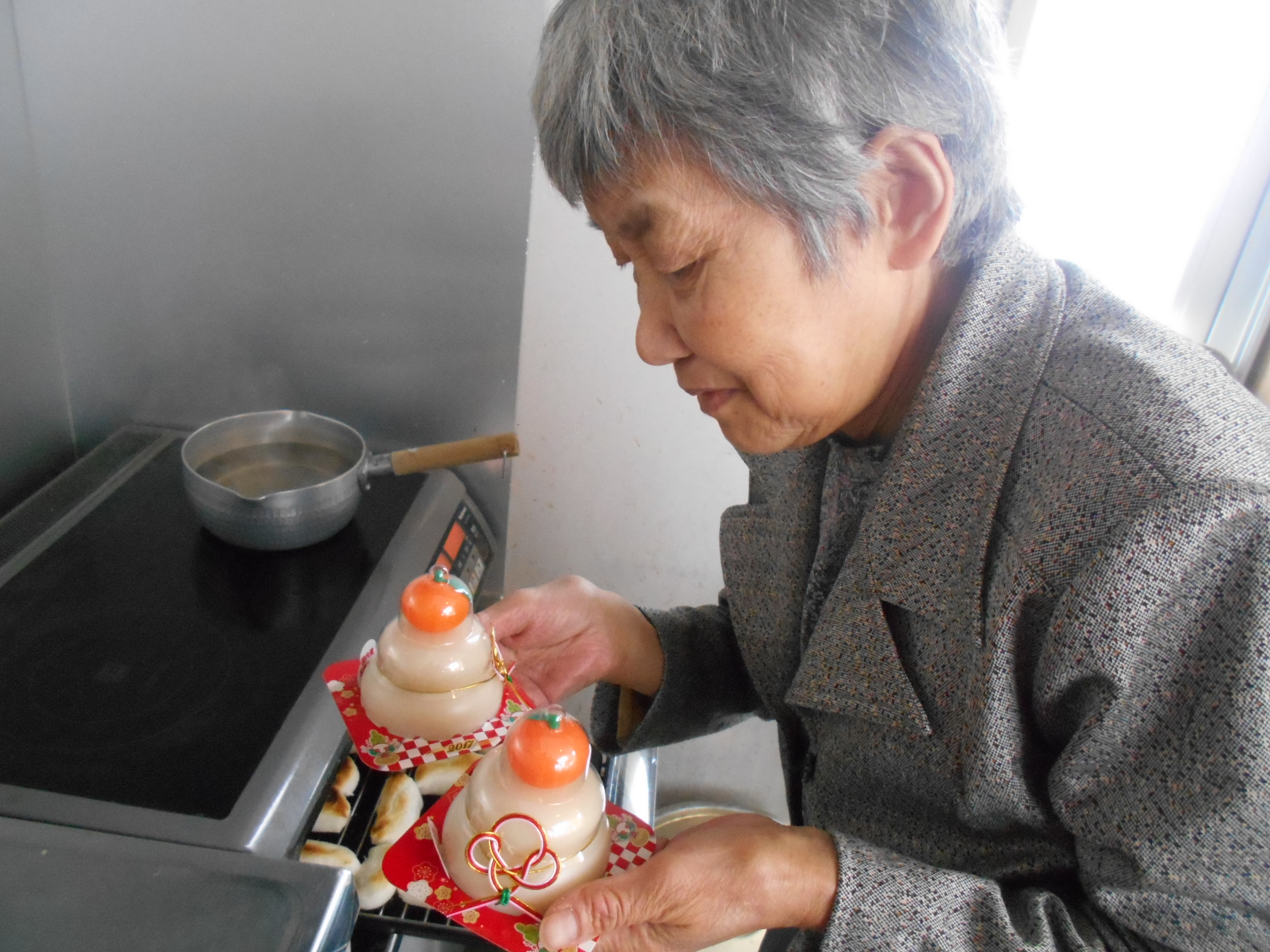 職員と一緒にお餅の焼き上がりを側で見守るK様。