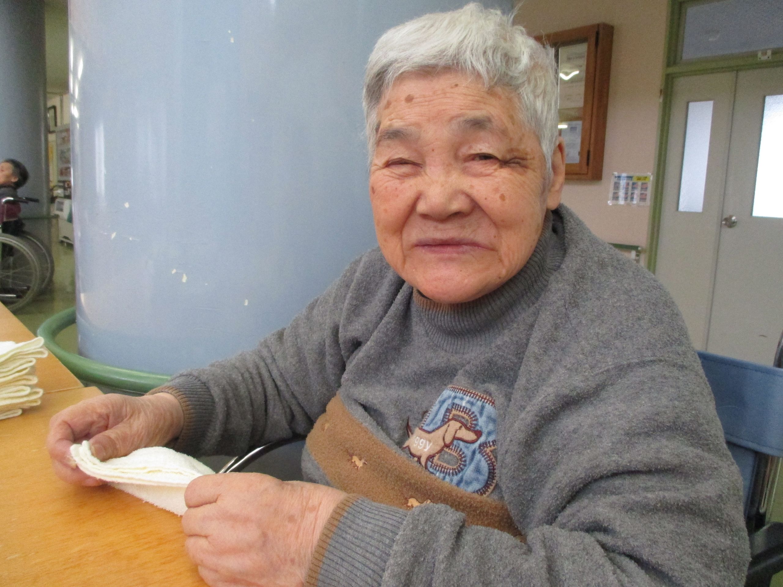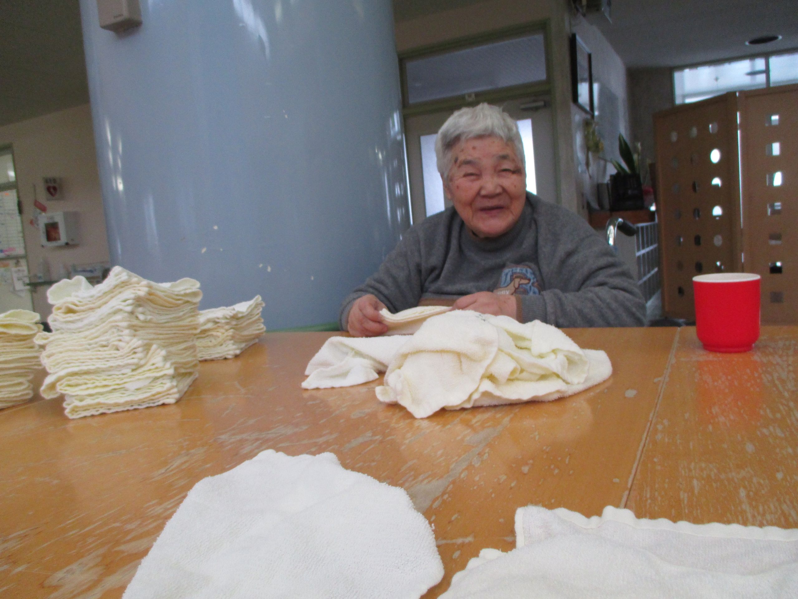 本日もいつものようにタオルを畳んで下さってます!そして、この笑顔♪「雪降ってらか?」など外の様子も気になっていらっしゃるようでした。。。