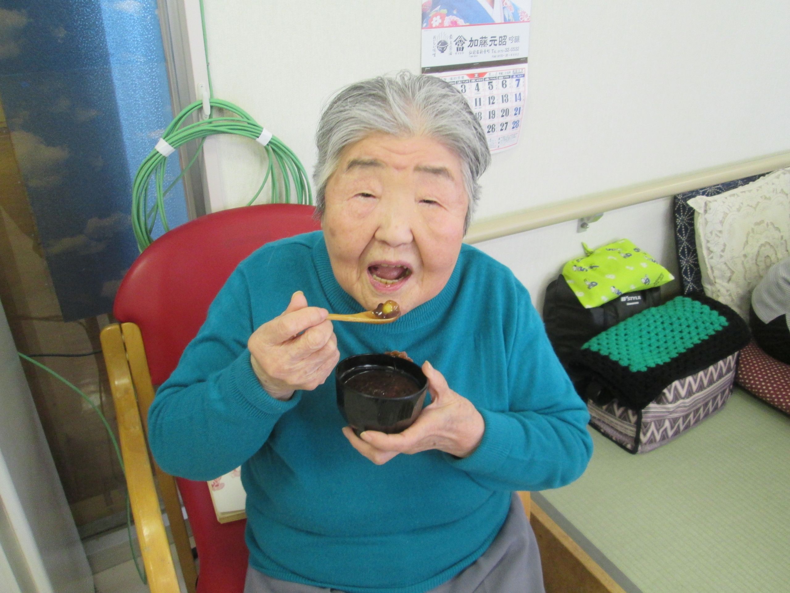 歌を歌いながら、おしるこ・・・栗ぜんざいをどう~ぞ!