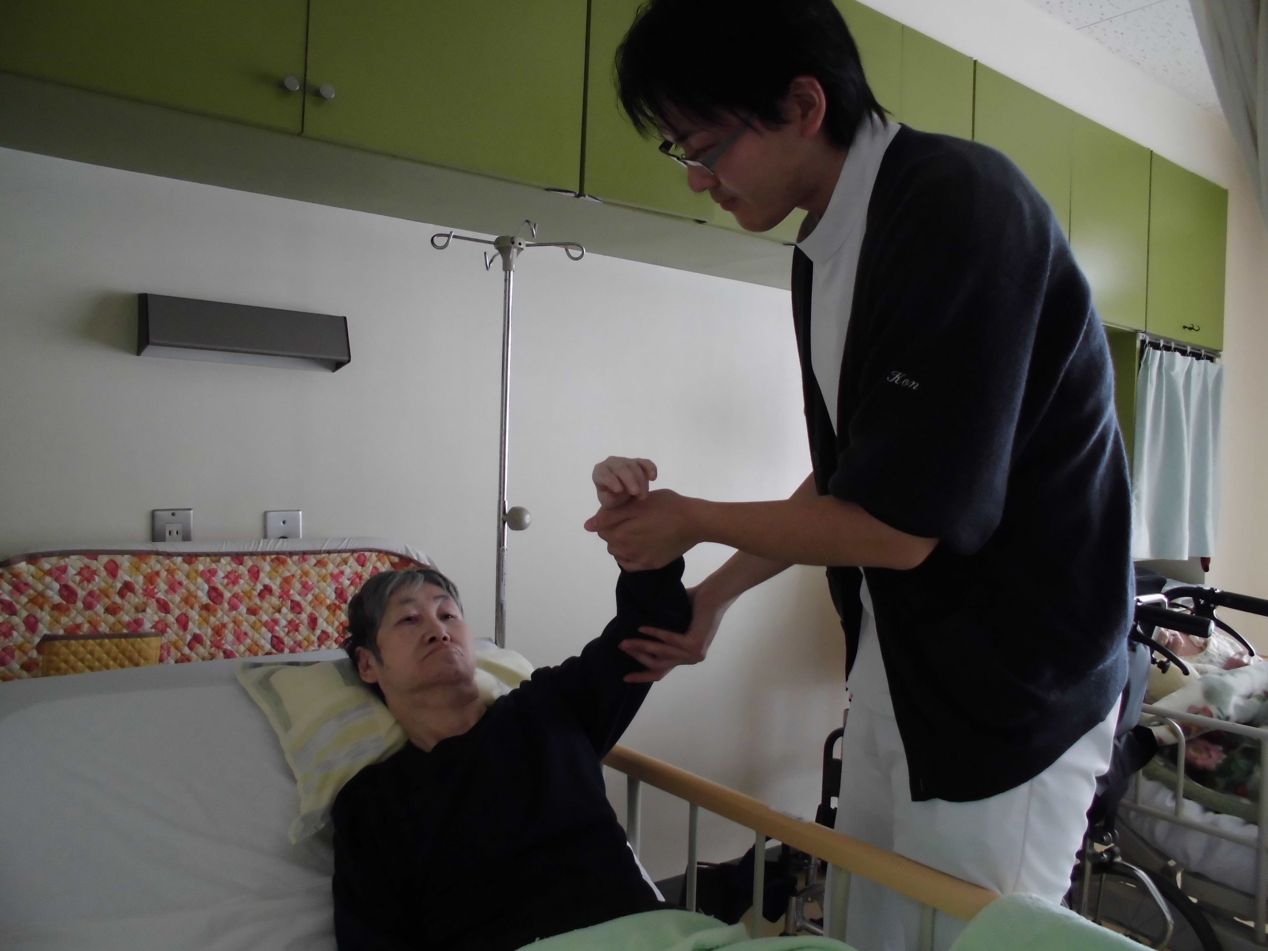 拘縮予防と筋力低下の予防のために、まず右上肢の機能訓練をしましょう。