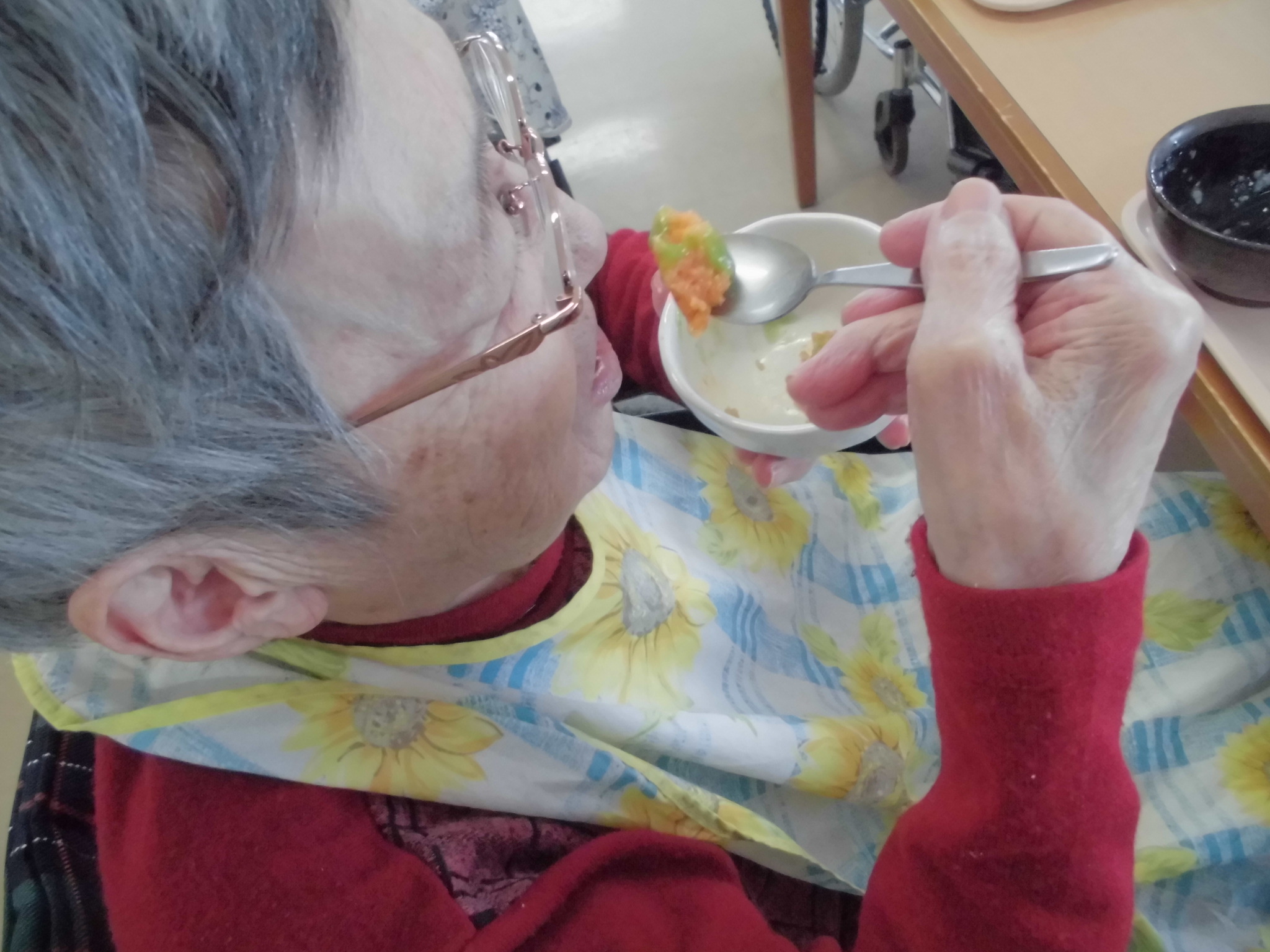今日のお昼の献立は節分ということもあり、とっても豪華でした。皆さんとても喜んでくれたいたのでおいしそうに食べるところを写真に撮りました。