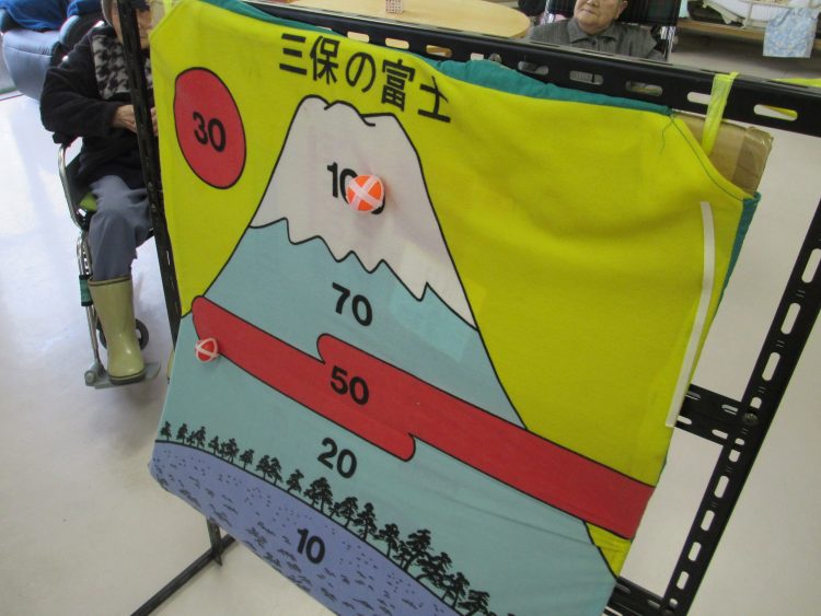 私も投げる。1投目100点。「オウー!」2投目はずれ。3投目50点。