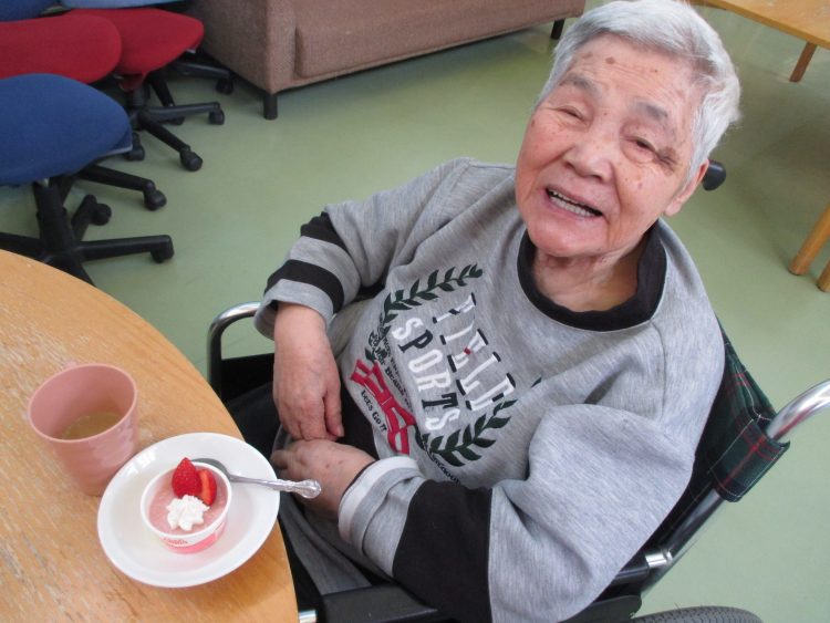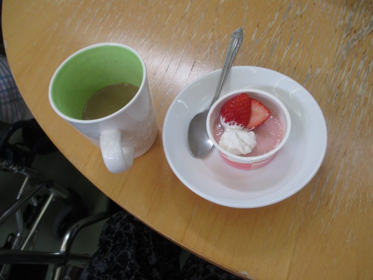 今日のお茶会はホワイトデーという事でささやかですが、小さなケーキを皆様に召し上がって頂きました。普段はお部屋で休まれているお客様も、美味しいケーキがあるということでお昼の少しの時間ですがホールで楽しく過ごされ、とても賑やかなひとときでした。