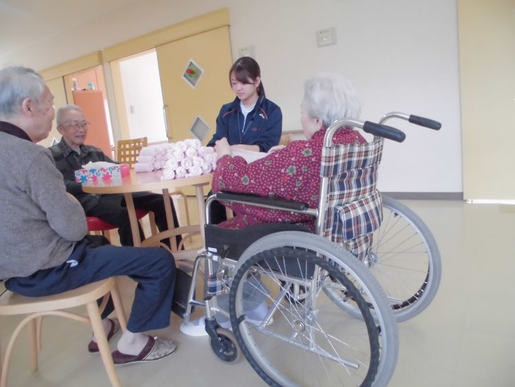 さて本日新人職員がお客様と軽作業をしながらコミュニケーションを図っていました。その他排泄介助やシーツ交換等、実際に介助を行い、不慣れな部分はいなめませんが、非常に丁寧に行っていました。このまま経験を積み円滑に介助を行って行って欲しいです。