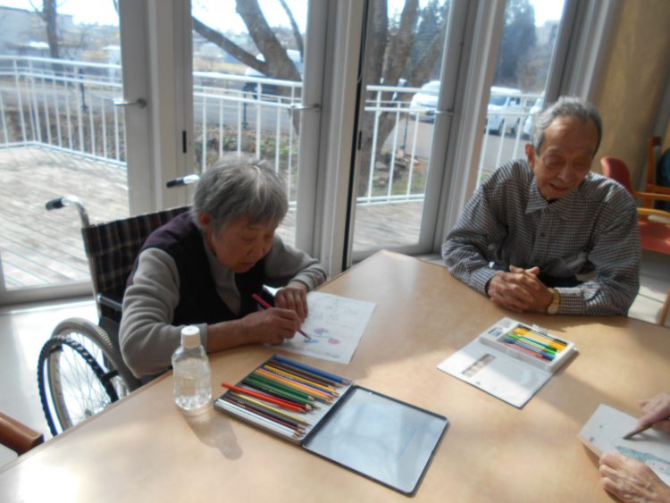 既に、脳トレを終わったI様は、他のお客様が塗り絵をしている所を完成を楽しみに