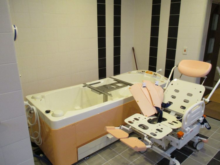 掃除した後の撮影で申し訳ありません!画面右側のストレッチャーに座っていただきながら、体を洗ったり、頭を洗ったり出来ます。その後に画面中央にある浴槽にストレッチャーを付けて浴槽が上がり、入浴が可能となる訳です。