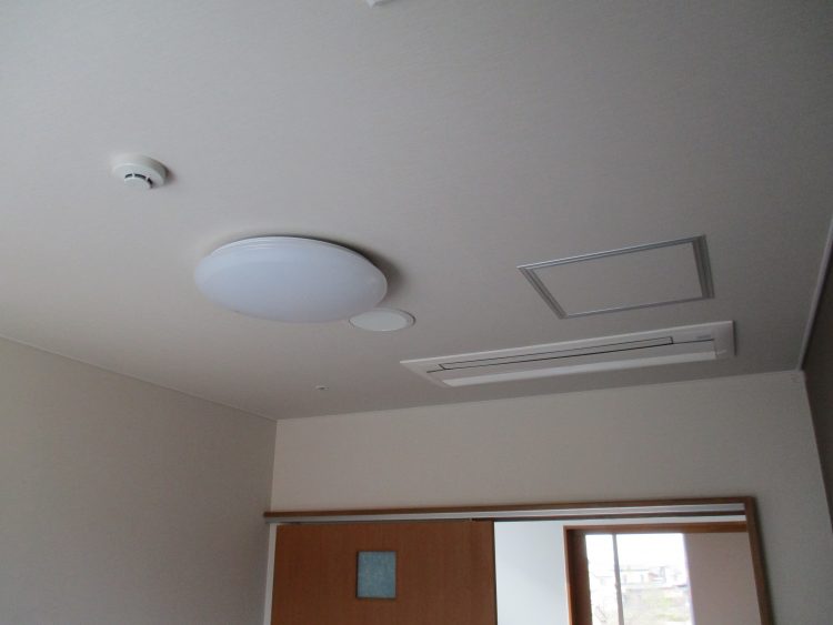 天井の写真ですが、このライトがとても明るいです。さすがLED電球は違いますね!そして写真の右側にありますこのエアコンも、少しの時間で部屋を温めてくれます。暖房はこのほかにもパネルヒーターも完備しておりますので、夏も冬も快適に過ごせること間違いないと思います。