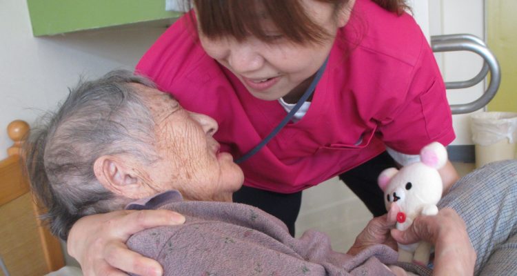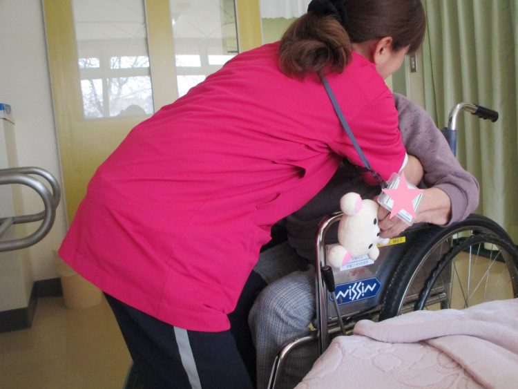 さて桜をみた後はお仕事の時間です。朝ごはんが終わり、居室のベッドでお客様に休んで頂く為に、ベッドへ移乗する様子です。今年入社した、Y介護士が優しくベッドへ移るお手伝いをします。