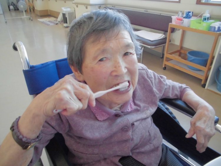 おいしい物を食べた後は、歯磨きです。K氏は「こうやるといいんだよ」とS氏に話していました。その後、S氏も真似をしていました。食べた後の歯磨きは忘れずにしましょう。 <ショート M・Y>
