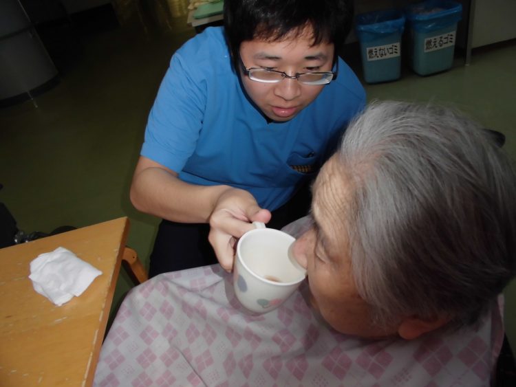 そしてお客様に水分補給のお手伝いをしているH介護員
