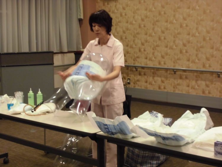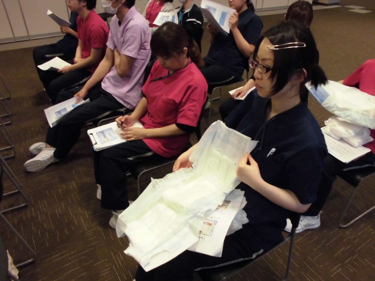 昨日ユニチャームの講師の方を迎えてオムツの勉強会が開催され、私も参加しました。オムツの特性や、当て方によって漏れを防ぐことができるなどためになるお話が聞けて良かったです。