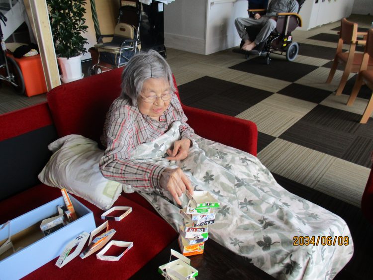 牛乳パック等を再利用して手作りジェンガで、Y様や他お客様と職員とで「ハラハラ~ドキドキ★」ゲームをを楽しみましたー。