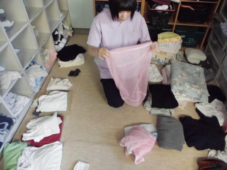 日中に入浴されたお客様の洗濯物も夜勤がたたみます。食事介助を終了したK/S介護員が夜勤中に使用する物品の準備を行い、 開いた時間で洗濯物を畳んで各お客様の棚に振り分けています。