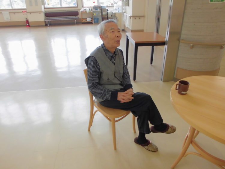 ブラックコーヒーを飲んでいる姿です。「今日は風が強いな、岩木山きれいに見えて