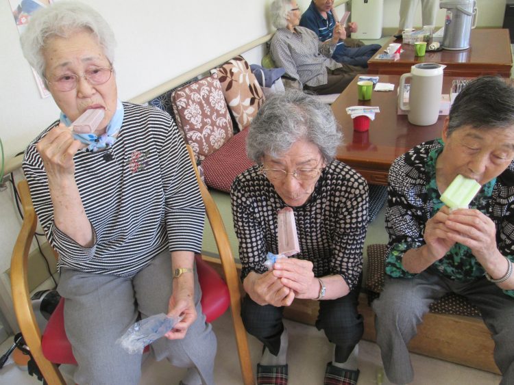 お好きなアイスを召し上がって、大満足の利用者様たちです。「もっと、こういう日があればいいのにの。」「今月はもうありませんので、来月またいらしてください。」「は~い。」おいしいものは、人を笑顔にさせます。