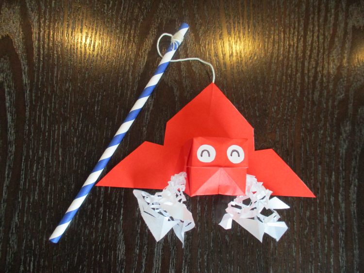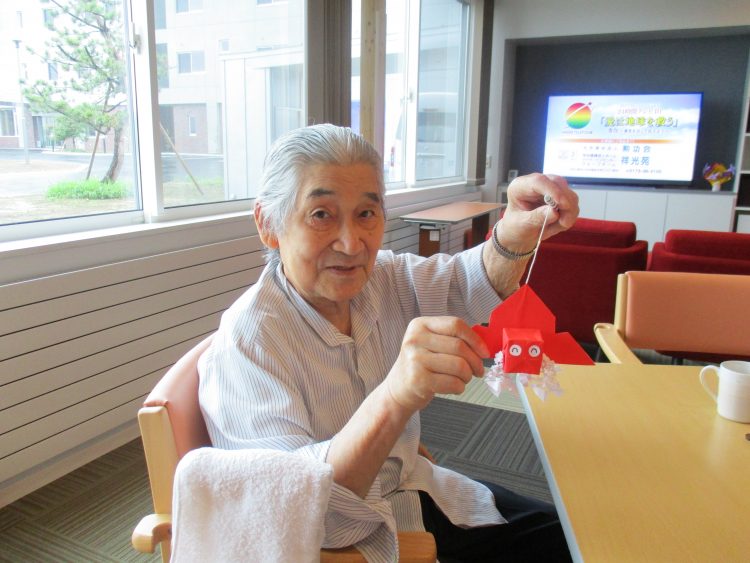 S様、「難しいなぁ、やって見るか!」と話され、職員と折り紙を折り、ハサミを使い完成されました。I介護士と相談し、目の大きさ、形を決めて作成していました。
