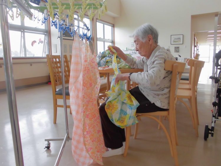 M様は身長が低いお客様なので、椅子に座りながらエプロン干しを手伝って下さいます。