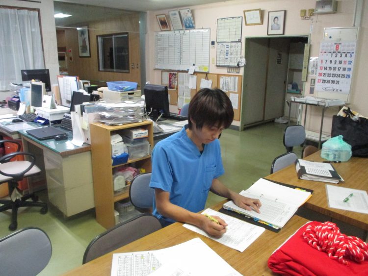 すっかり夜勤も板についてきたルーキーのY介護士です。お客様の排泄状況をまとめ、次の日の日勤者に申し送る準備をしています。この作業はお客様の健康管理につながる大事な仕事です。
