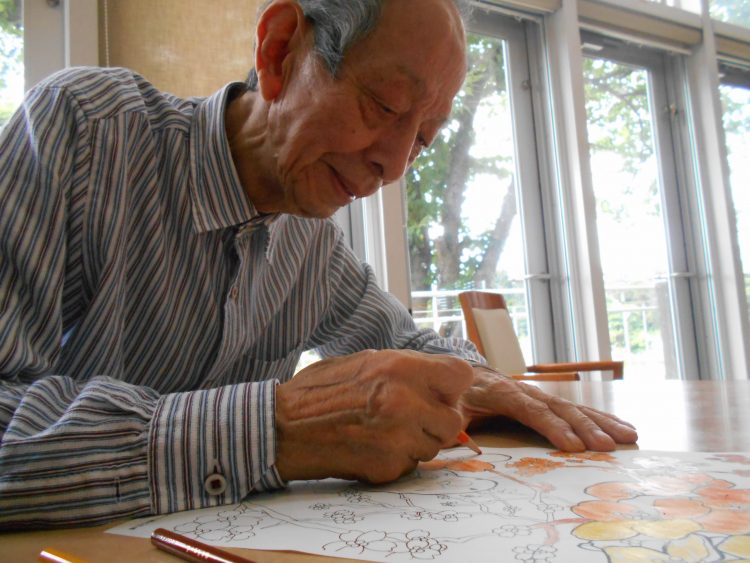 I様は、紅葉の塗り絵に色を付けています。紅葉は季節的に早いですが、真剣な表情で、とても丁寧に塗り進めています。みなさん、集中して行っていました。