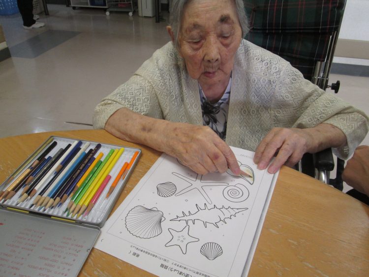 脳トレが難しいお客様はいつものように塗り絵を行いました。今日の塗り絵は夏にちなんで貝殻の塗りえを行いました。