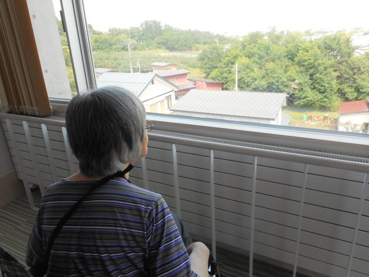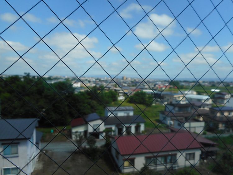 これがその風景です。近くには何件もの家が、遠くには弘前の町が見えます。ちなみに窓は網目模様を張っております。