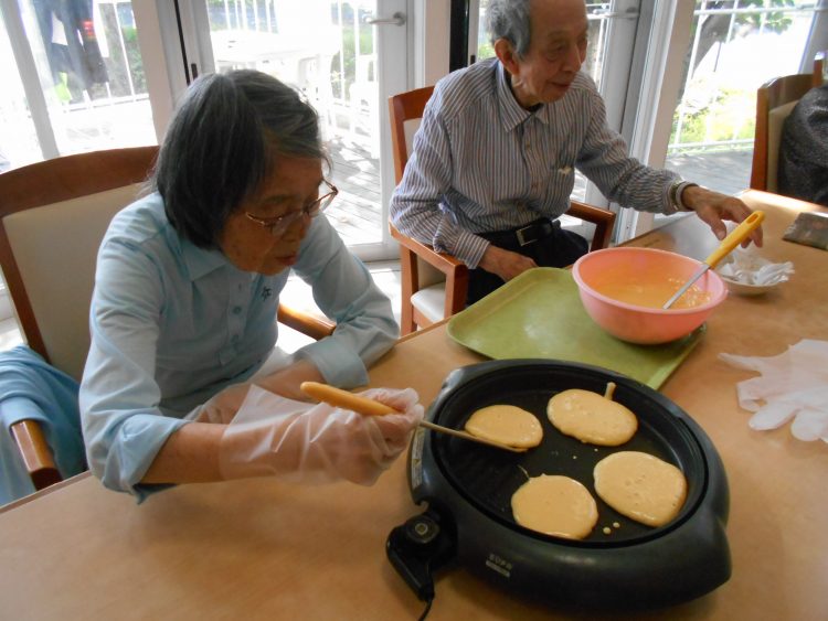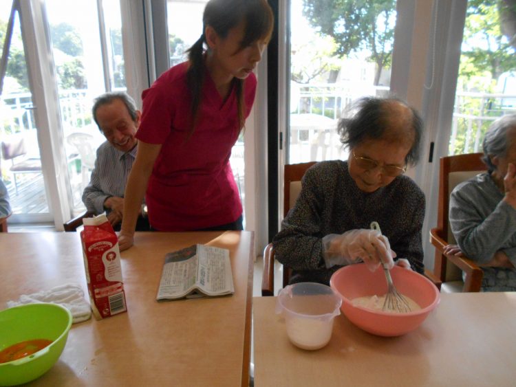午後の時間に、大好きなホットケーキを、皆さんで作りました。まずは、下ごしらえ、I様、卵を割り入れています。