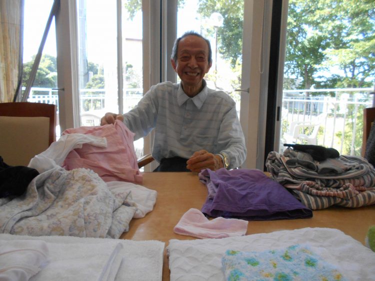 午後からは外のテラスで干していた洗濯物をたたむ作業をお客様と一緒にしました。