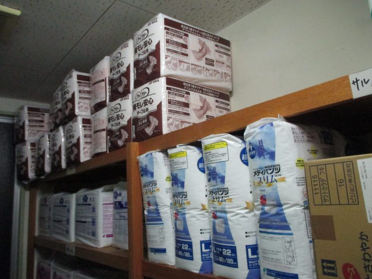 我々介護職員の重要な仕事の内のひとつがお客様の排泄介助で、それに使用するオムツを発注、整理整頓したりと日々の仕事が円滑に進める様にしています。
