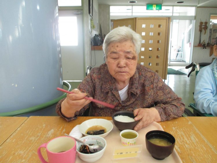 C様に食事を配膳するとエプロンをつけるのを忘れご飯を頬張っておられました。「今日もご飯美味しいよー」と話されあっと言う間に完食でした。