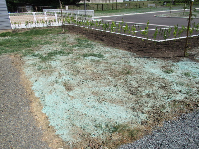 写真では、「白砂]のようですが…実は「芝生の種」!!実際は薄緑色なんです 数ヶ月前にも蒔いたのですが…豪雨で流されてしまい、