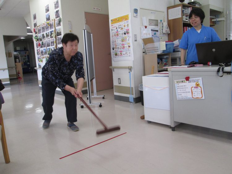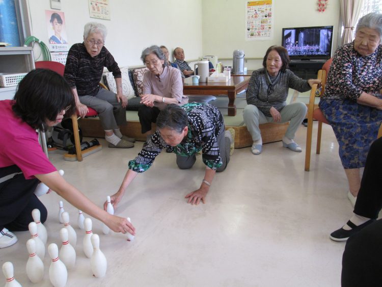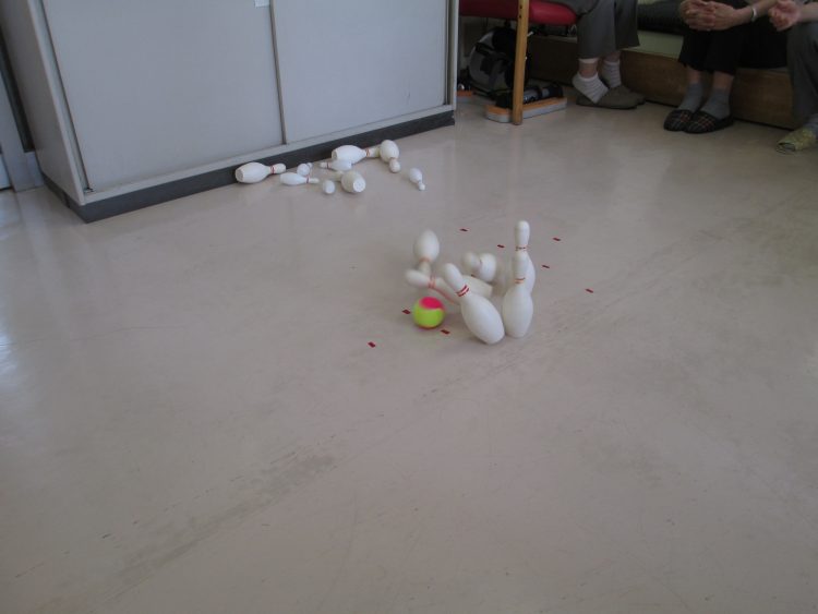 ゲートボールのかまえでボーリングのピンを倒すぞ!
