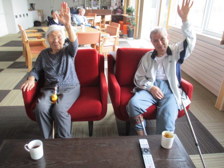 こちらは、体操を行っている様子です。職員と一緒に、手足の上下運動を行っておりました。休息しながら、(コーヒーや温かいお茶を飲みながら)無理なく、行いました。