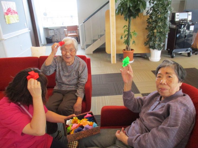 その後、折り紙でお花を作りました。どうでしょうか?かわいい髪飾りが、出来ました。お似合いですね。