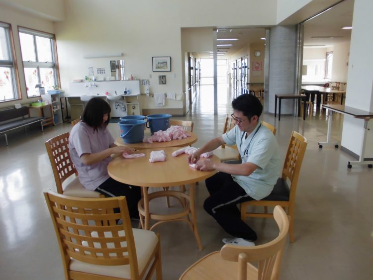 毎日の日課として、顔ふきタオルをたたむ仕事があります。職員同士で行ったり、お客様と一緒にたたんだりしています。この時間はコミュニケーションをはかる時間として、有意義にしたいと思っています。 ショートステイ(S:Y)