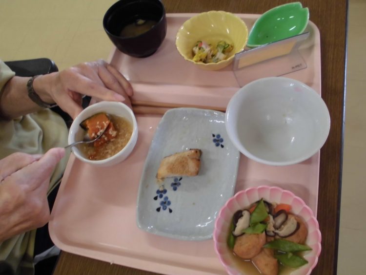 本日のメニューは、ご飯、味噌汁、メバルの南部焼き、一口がんもの煮物、櫻大根漬けでした。急にカメラを向けられ、少しビックリしています。その後全部食べました。食後ホットコーヒーを飲み昼食終了です。