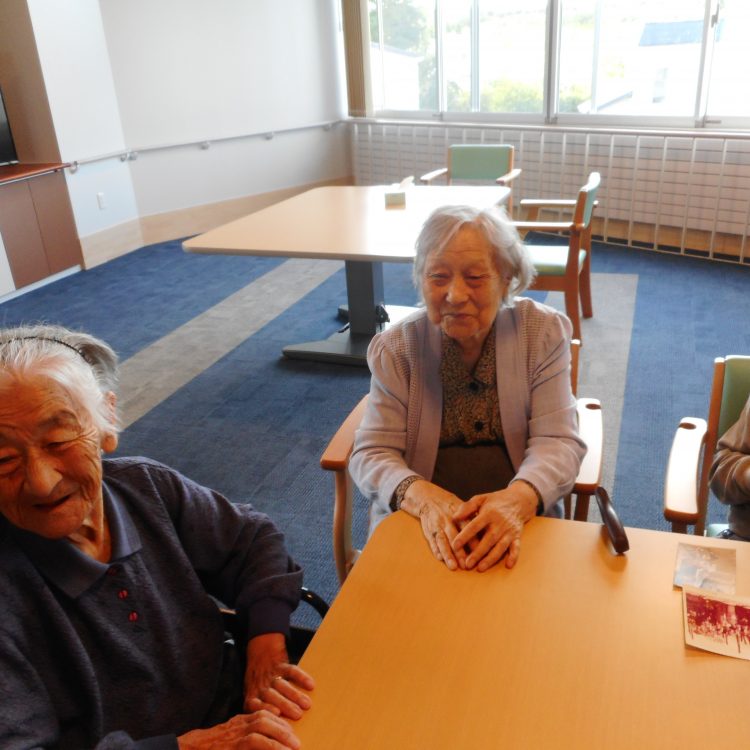 ご飯を食べ終え、日差しのいい山崎の午後、皆さんホールへ集まり談笑しておられます。皆さんとても仲が良く、職員ともいい笑顔で話されています。