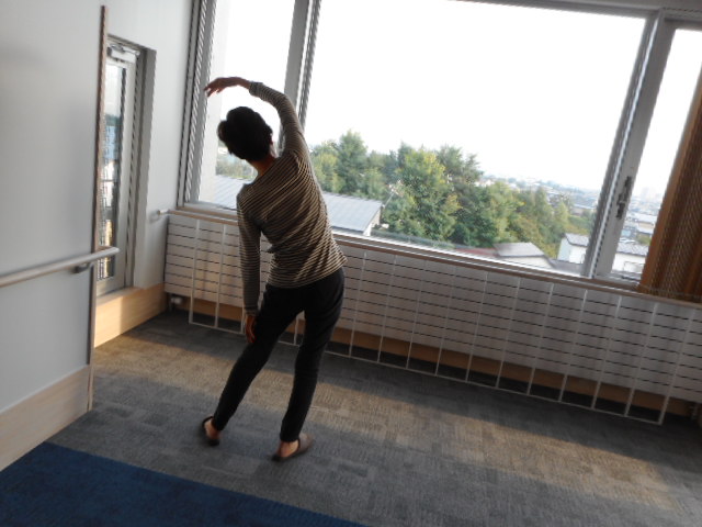 こちらは朝起きて外の景色を見ながら体操中の様子です。「天気が良くて気持ちいね!景色もいいよ。」と笑顔で話されておりました。
