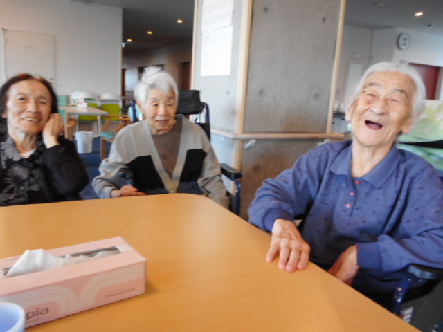 職員と話したり、持参したおやつを皆で分けあったりして笑いが飛び交う