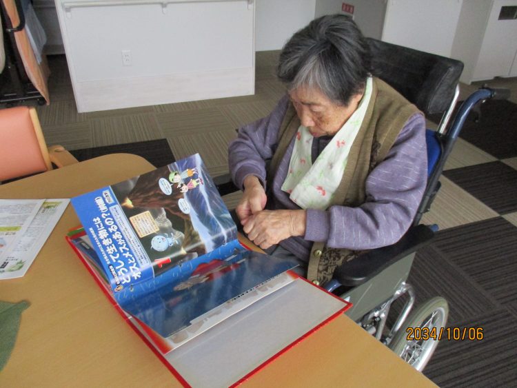読書をしながら、ページめくりの訓練「ながなが難しくて…でも頑張るよ」