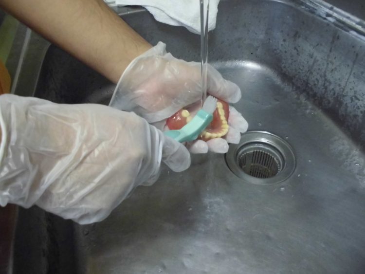 ゴム手袋越しでも冷たい水でお客様の義歯を一つずつ歯垢を洗い落としていきます