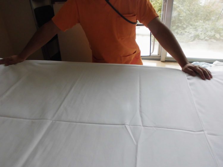 お客様が入浴を行っている時に介護員Ⅰさんはお客様のシーツ、布団カバー、枕カバーを新しい物に替えてお客様のベッドを綺麗にしています。