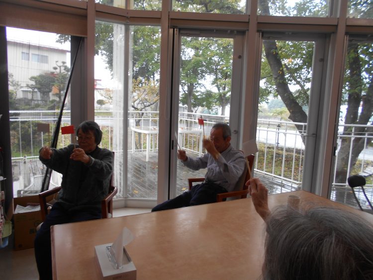 今日は先日皆様に折り紙で作って頂いた紅白の旗を使ってみんなで旗揚げ大会を