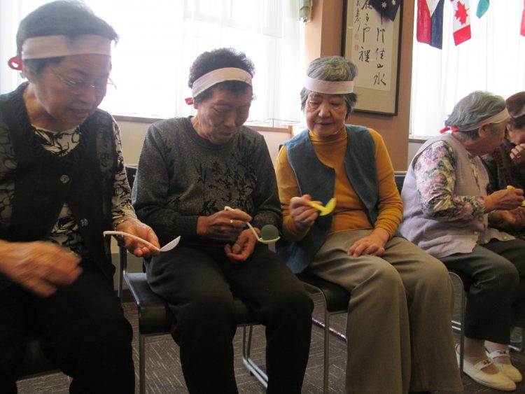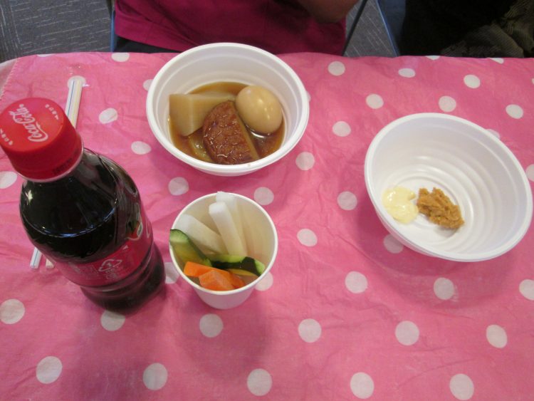 おでん、野菜スティック、コーラーを3人の職員で協力して食べるの競技